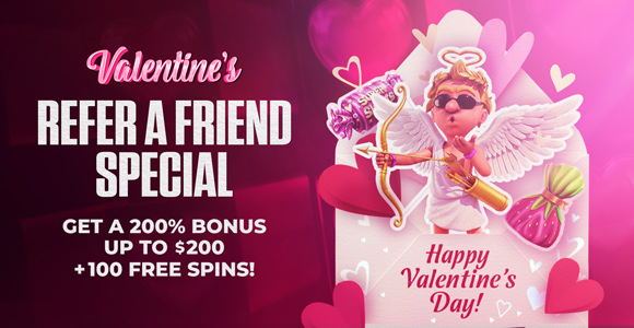 From February 13–22, score 100 Free Spins in addition to our 200% up to $200 Casino Refer-A-Friend offer for every friend you bring on board (min dep: $50).