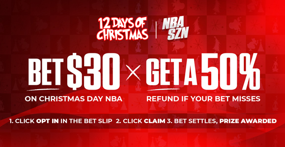 Bet $30 or more on any NBA game on December 25. If it hits, you win. If not, score a 50% Free Play Refund up to $125! This special offer is part of the 12 Days of Christmas. Want to learn more? Click here.