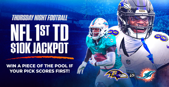 Place a 1st TD Scorer bet on Ravens vs. Dolphins, and if it hits, you’ll win your bet AND a piece of $10,000. Lock in your pick today!