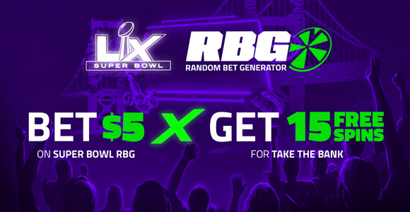 Bet $5 or more on any SUPER BOWL RBG selection between now and Sunday, February 8, at 6:30 PM ET, and get 15 Free Spins for the slot game Take the Bank on us!