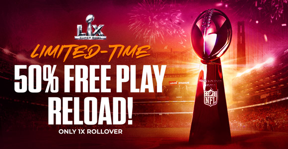 Betting the Big Game just got easier thanks to your exclusive 50% Free Play Reload Bonus with only a 1x rollover!